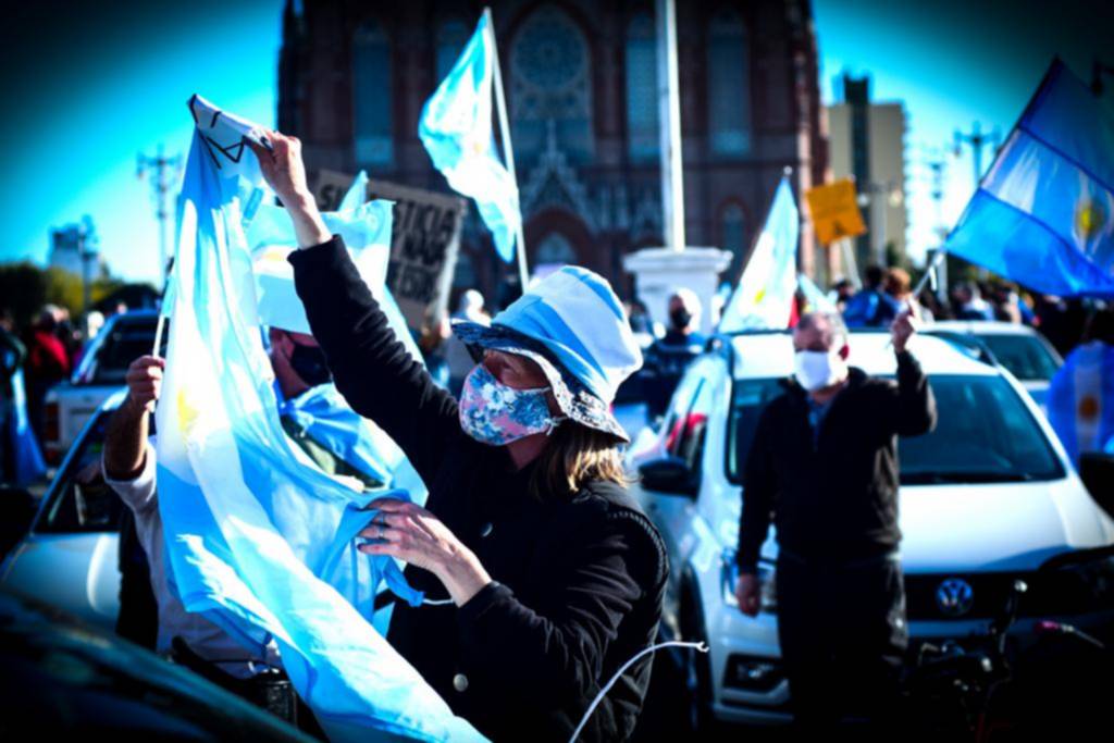 Pasadas las 16 -la hora señalada por la convocatoria gestada en redes sociales, grupos de familias, adultos mayores y también algunos jóvenes poblaron el sendero central de la Plaza, con los barbijos de rigor y portando banderas argentinas o carteles.