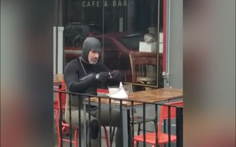 En Mar del Plata los bares y restaurantes solo están atendiendo con mesas afuera por la pandemia del coronavirus. Por este motivo, un vecino de dicha ciudad decidió ironizar sobre la situación y aprovechó el domingo lluvioso para sentarse a tomar un café con un traje de neoprene puesto.