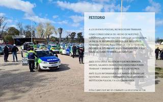 Los policías difundieron un petitorio que incluye pedidos de aumentos salariales, aumento en el pago de la hora Cores y la hora Polad, pago en tiempo y forma de las horas adicionales, ya que se están cobrando con demoras de hasta 120 días; provisión de uniforme y móviles en condiciones de prestar servicio.