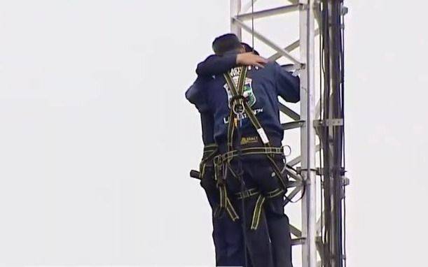 En un momento un hombre intentó trepar para socorrerlo, pero de inmediato fue interceptado por los integrantes del grupo que trabajaba en el lugar. Sin embargo, unos minutos más tarde y con un arnés colocado y otro para Medina fue quien subió y logró convencer a su amigo para que desistiera y finalmente bajara de la torre.