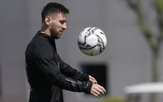 messi y di maría en la última práctica de la selección antes de viajar con destino a paraguay / afp