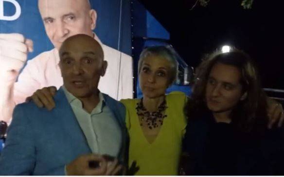 Acompañado de su esposa, María Mercedes González, y otra mujer, Espert mira a quien lo está grabando y dice: "primera declaración profunda como diputado electo, gracias a Dios tengo fueros: quiero tetas".