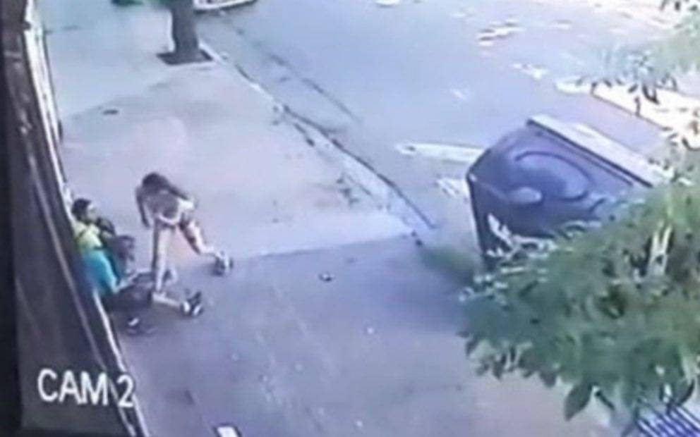 El hombre logró levantarse e intentó ocultarse detrás de un contenedor de basura, tras lo cual mantiene una discusión con la mujer, quien se aleja del lugar caminando.