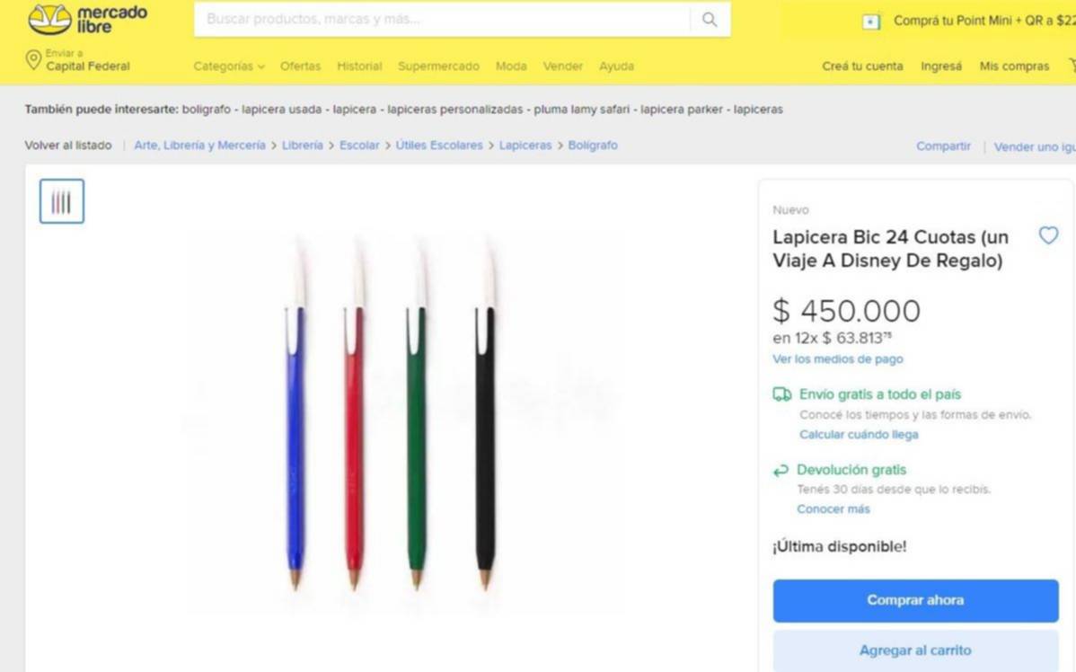 El aviso dice "Lapicera Bic 24 Cuotas (un Viaje A Disney De Regalo)" a $450.000 y la posibilidad de pagar en 12 cuotas de $63.813,75.