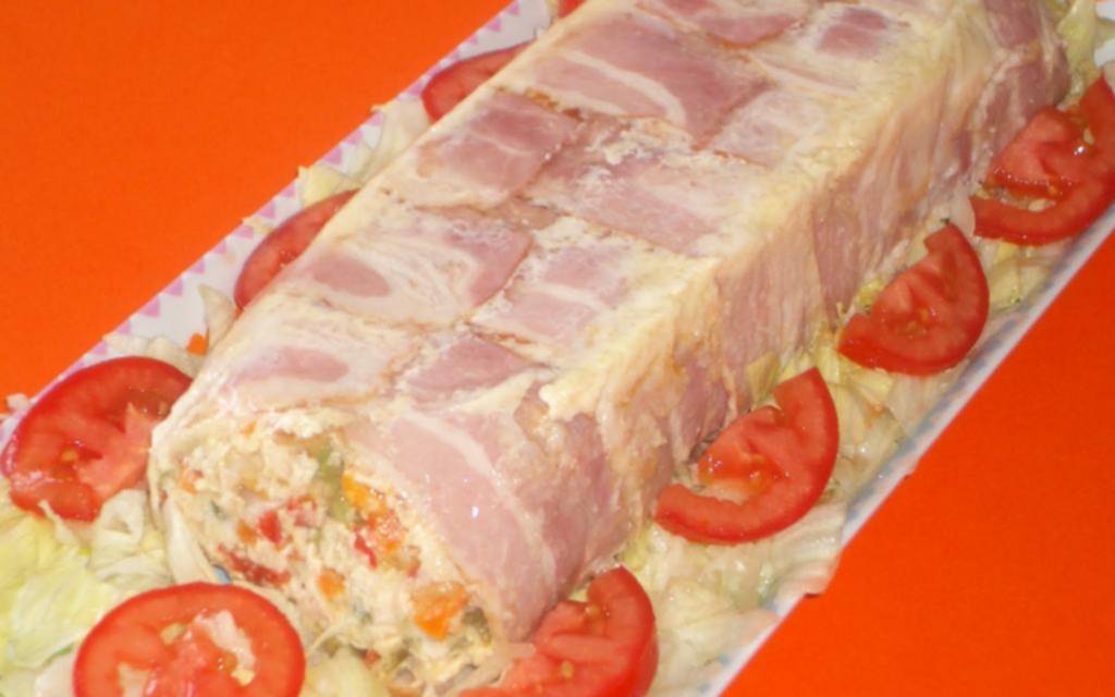 Doblar las fetas de panceta sobre el relleno, cubrir con papel de aluminio y cocinar a baño María en el horno a 180º, durante 55 minutos.