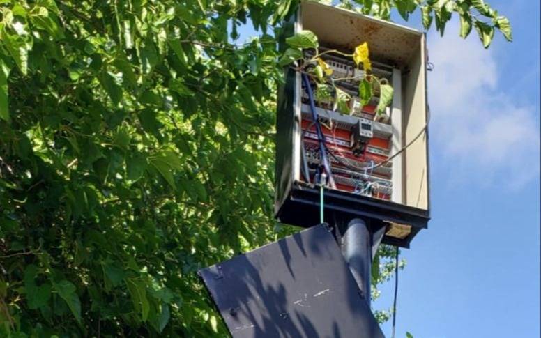Según describió uno de los vecinos, se encuentra con la tapa rota y, por ende, con los cables sueltos.