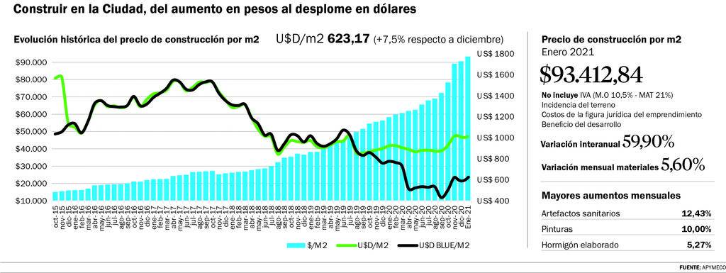 Ello pese a que el costo de construir en la Ciudad aumentó casi 60 por ciento en un año, muy por encima de la inflación, que fue del 36,1 por ciento. Y a que en enero pasado avanzó 3,16 por ciento, empujado, sobre todo, por el incremento en el costo de los materiales. De este modo, según el índice que elabora la Asociación Pymes de la Construcción (APYMECO), el costo de construir en la Región fue, en enero último, de $ 93.412,84 por metro cuadrado (el indicador, vale remarcarlo, no incluye IVA; incidencia del terreno, ni el beneficio del desarrollo).