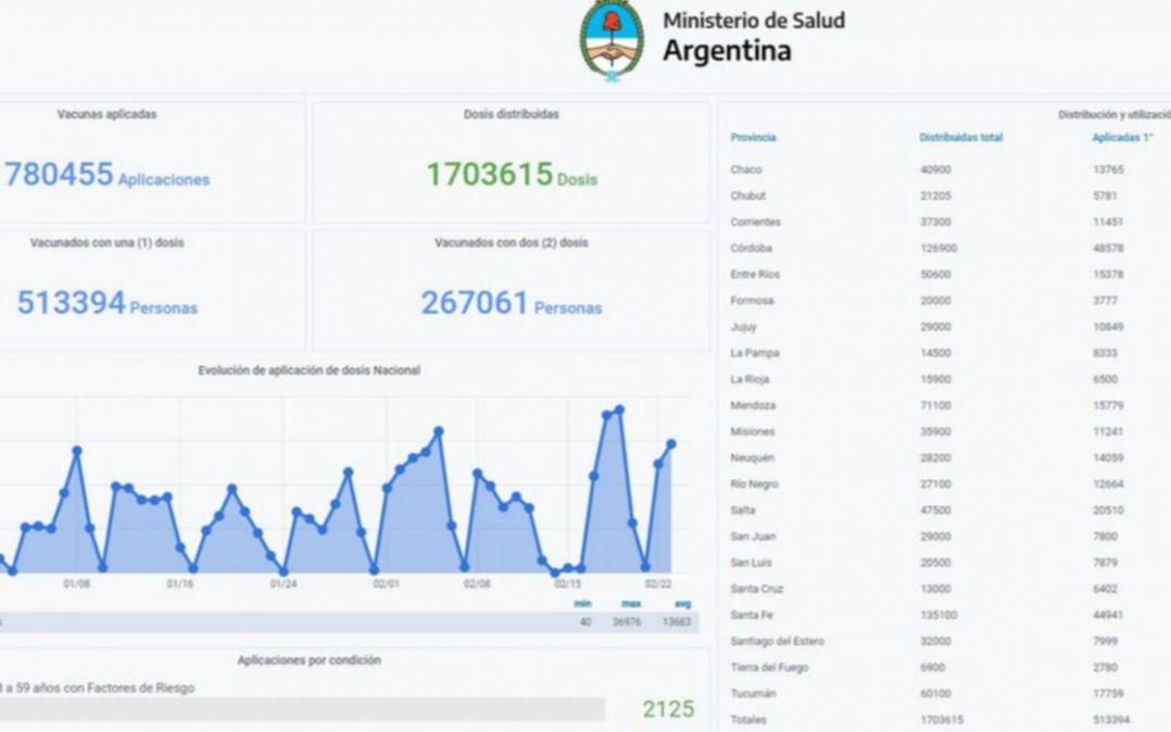 Según la última actualización, de las 6 de la mañana de hoy, hubo un total de 1.703.615 de dosis distribuidas y 780.455 aplicaciones.