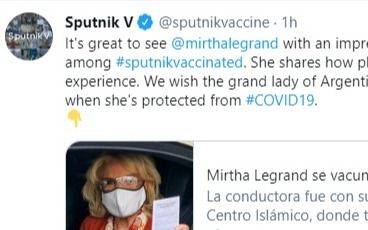 "Es genial ver @mirthalegrand con una impresionante carrera de 80 años, entre los #sputnikvacunados", se señaló en la cuenta que informa sobre estudios, contratos y países que aplican la vacuna desarrollada por el Centro Gamaleya y el Fondo Ruso de Inversión Directa (RDIF, por sus siglas en inglés).