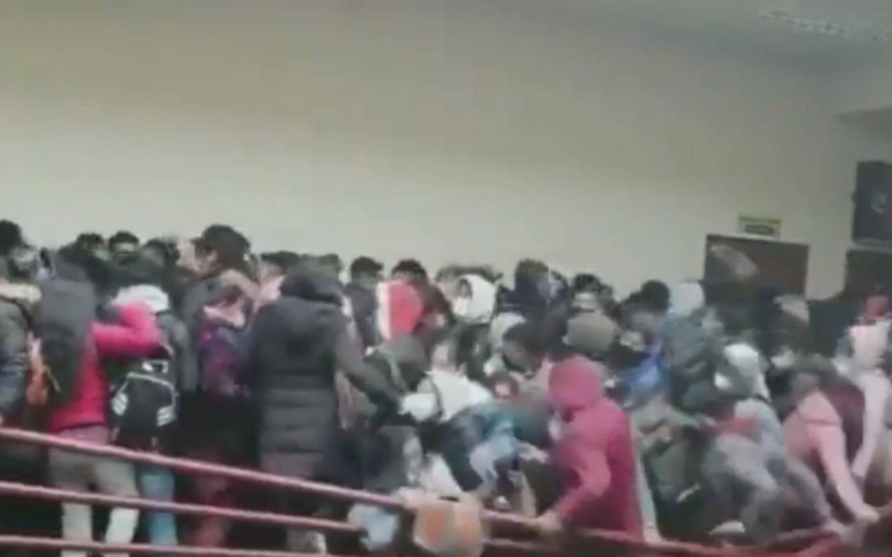 Dos videos que circularon muestran el momento en que mientras un numeroso grupo de estudiantes forcejea entré cánticos en una galería hasta que las barandas ceden y las ocho personas caen al vacío y se estrellan cuatro pisos abajo