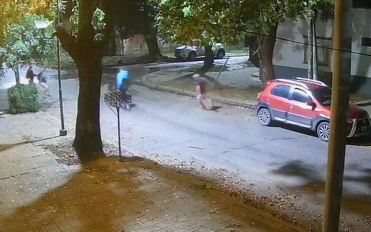 Las víctimas, un hombre y su sobrino, según se puede ver, caminaban por la zona cuando fueron abordados por un sujeto armado que descendió de un automóvil que parece un Toyota Etios Cross de color rojo y negro. Y con él corre hacia sus "presas" un menor de edad que se encarga de tomar un bolso arrebatado a las víctimas. Ambos luego se suben al auto donde los espera un cómplice y se van.