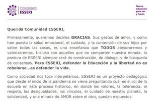 Cabe indicar que la comunidad de madres y padres del colegio Esseri de La Plata compartió un video en apoyo a la institución por el amparo presentado ante la Justicia para mantener la presencialidad de las clases.