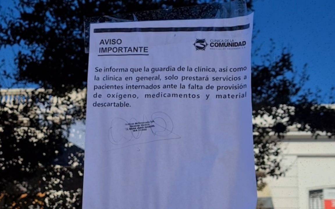 En la puerta del sanatorio ubicado en La Merced 383 las autoridades colgaron un cartel que dice "Aviso importante: Se informa que la guardia de la clínica, así como la clínica en general, sólo prestará servicios a pacientes internados ante la falta de provisión de oxígeno, medicamentos y material descartable".