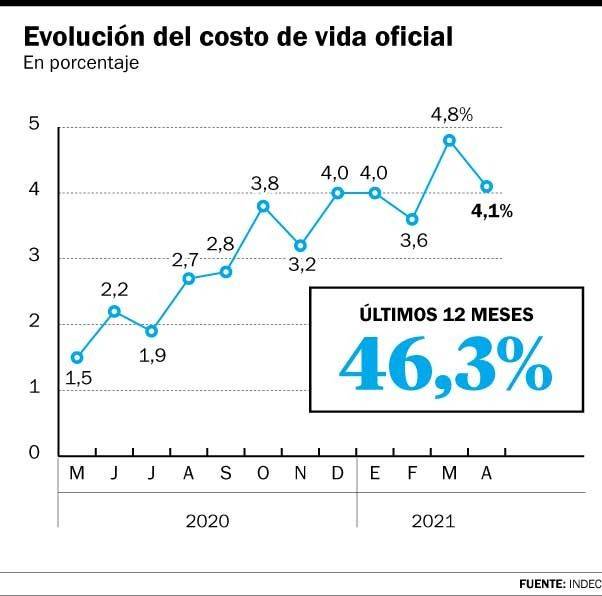 La inflación sigue en guarismos muy elevados, aunque desaceleró levemente en abril en relación con el pico de marzo y se ubicó en 4,1 por ciento, y en el interanual trepó a 46,3 por ciento. según informó el Indec. En los primeros cuatro meses del año la suba de precios acumulada alcanzó el 17,6 por ciento y le puso presión a la meta sostenida por el Gobierno, que espera un índice de 29 por ciento a lo largo del año.