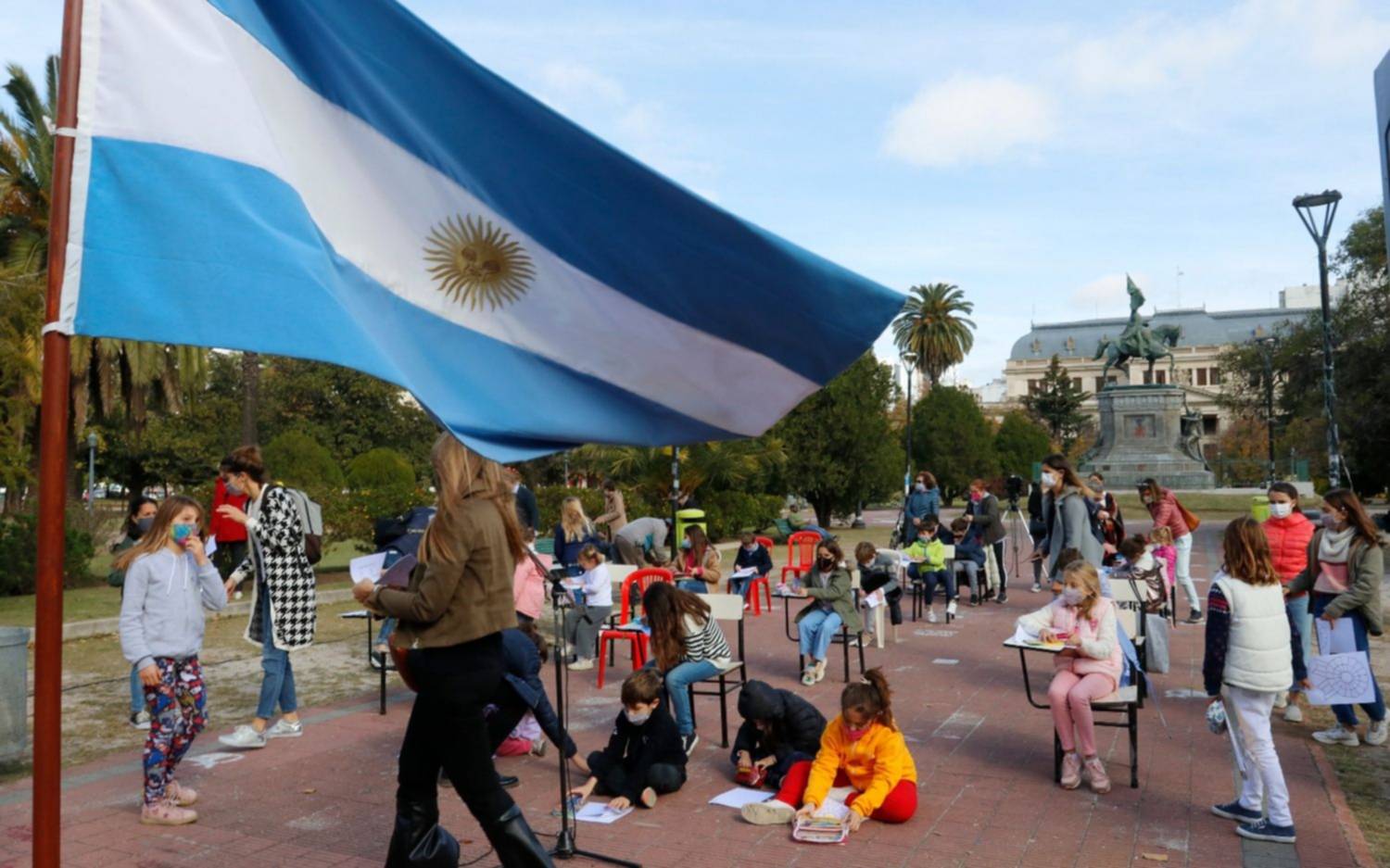 “Dijeron 15 días y ya llevamos 5 semanas", aseguraron los organizadores de la movida. En ese marco, un grupo de niños y una maestra cantaron el himno nacional argentino y luego se dispusieron a dar una clase en medio de ese espacio público platense.