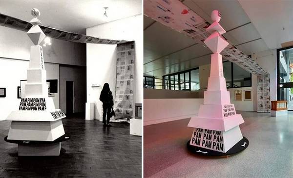A la izquierda, La “Torre de Babel” de Pazos y “Diario sin fin” de Luján Gutiérrez en el Di Tella. A la derecha, sus recreaciones en el Centro de Arte