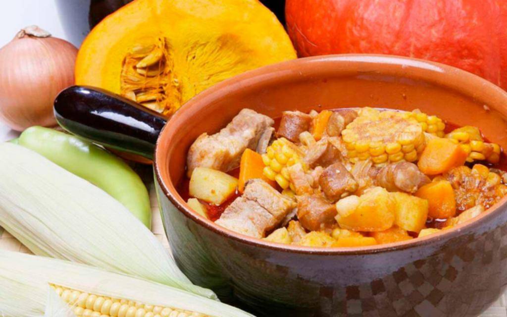 A los 15 minutos de haber puesto el zapallo, añadir el resto de los ingredientes; el chorizo colorado, el pechito de cerdo cortado en cuadrados, agregar el chorizo criollo cortado en rodajas, la panceta ahumada cortada en bastones, la tapa de asado cortada en cuadrados.