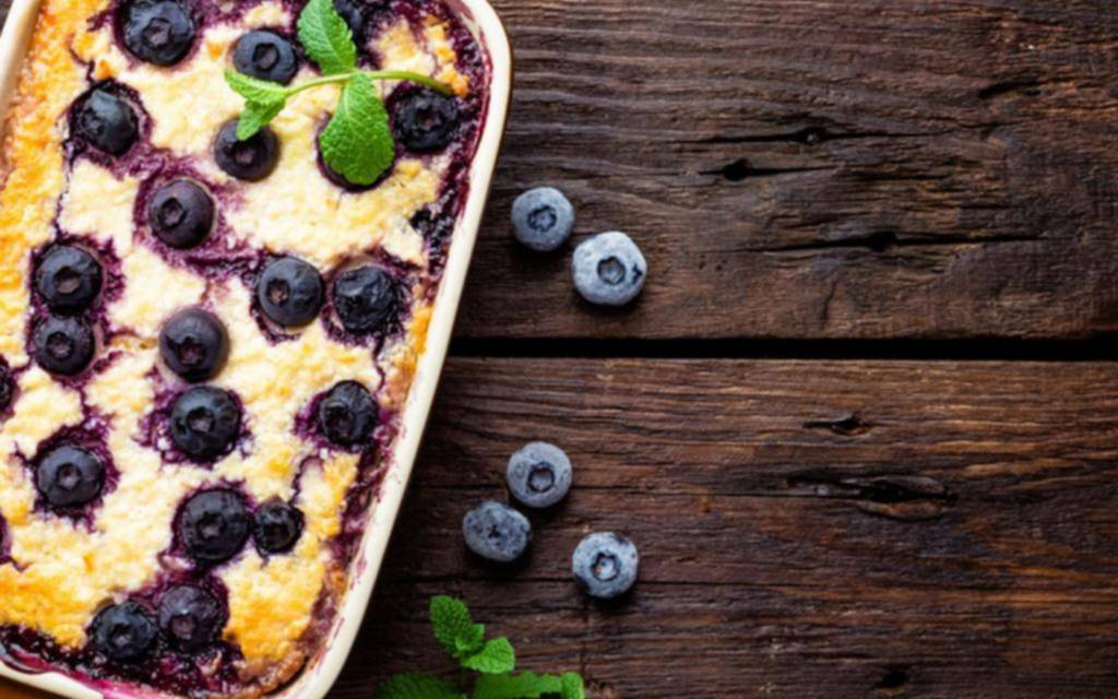 Prender el horno y precalentarlo a fuego medio (180°). Colocar la preparación en una budinera y hornear entre 30 y 40 minutos. Esperar que se enfríe para cubrirlo con los arándanos. Para la cobertura de arándanos, se pueden poner los frutos en una sartén y dejar que se cocinen como una especie de mermelada, agregándole un poco de azúcar.