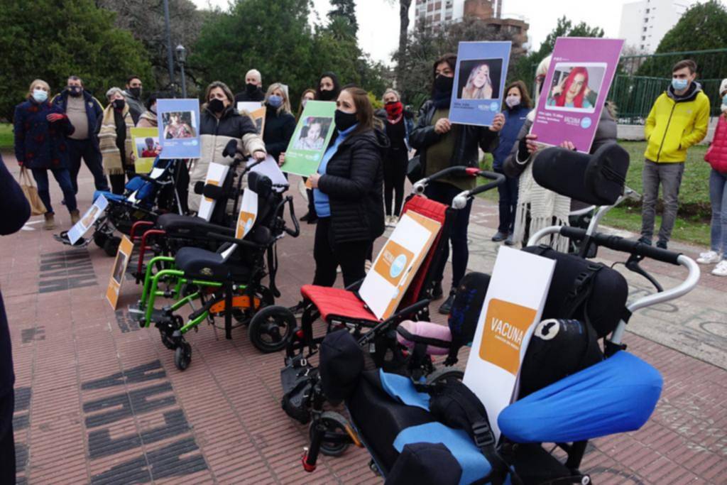 Los padres se convocaron en la Plaza San Martín con las sillas de ruedas vacías porque, aclararon, sus hijos no pueden acompañar el reclamo por pertenecer a grupos de riesgo. “Nos unimos para exigir la aprobación de un proyecto de ley que habilita al gobierno de la Provincia de Buenos Aires a comprar la vacuna Pfizer para menores de 18 años con patologías de riesgo”, se explicó.
