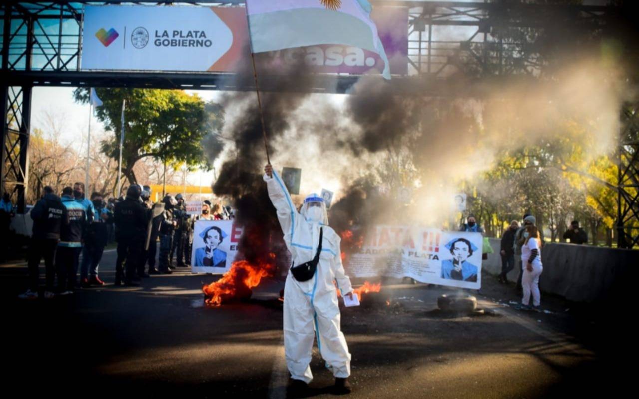 Cuando los manifestantes, personal médico, de enfermería y también del sector de limpieza, intentaron cortar parte de Diagonal 74 hacia el acceso de la Autopista La Plata-Buenos Aires fue cuando los uniformados avanzaron para neutralizar la medida y allí se registraron los momentos de mayor tensión.
