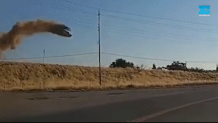 El video fue filmado por el auto que llegó a una curva y se encontró con una escena digna de una película de ficción: de la nada salió volando por el aire otro rodado dejando una larga columna de humo antes de estrellarse contra el asfalto.