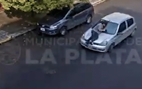 Minutos más tarde el hombre se paró frente a un auto Renault Clio que circulaba por la calle en ese momento y se subió arriba del capot. El conductor, lejos de bajar, volvió a poner primera y avanzó por la calle 49.