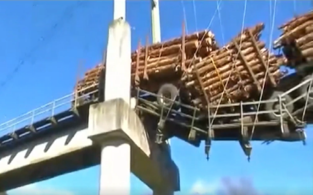 En la región de Carahue, en Chile, se vivieron momentos de suma tensión por un camión que transportaba un amplio cargamento de troncos y quedó al borde de caerse al vacío al ceder un puente vial.