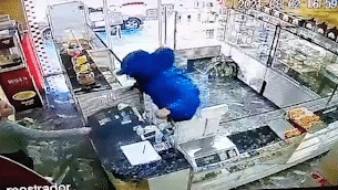 La escena se inicia cuando dos empleadas del comercio están en sus labores y una de ellas tiene un mate en la mano. En ese momento aparece el delincuente y arma en mano amenaza a la empleada que está junto a la caja registradora. La otra trabajadora reacciona y le tira con el mate. Pero el ladrón no se amedrenta y mete medio cuerpo dentro del espacio donde está la caja, arranca los cables y se la lleva con el dinero que tenía dentro.