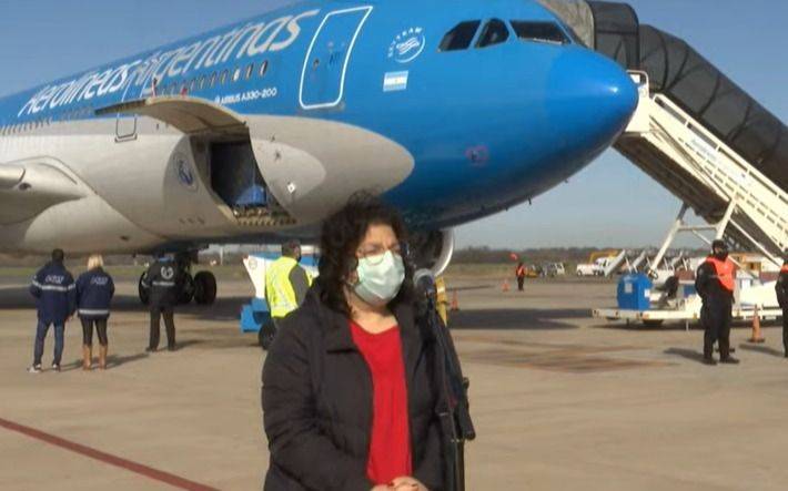La aeronave Airbus 330-200, matrícula LV-GIF, bajo el número AR1065, trajo en sus bodegas 650.000 dosis, 400.000 correspondientes al componente 1 y 250.000 al componente 2. En la terminal aérea, la titular de la cartera sanitaria brindó una conferencia de prensa en la que ofreció detalles de las reuniones que mantuvo con miembros del Instituto Gamaleya de Rusia y del Fondo Ruso de Inversión Directa (RDIF).