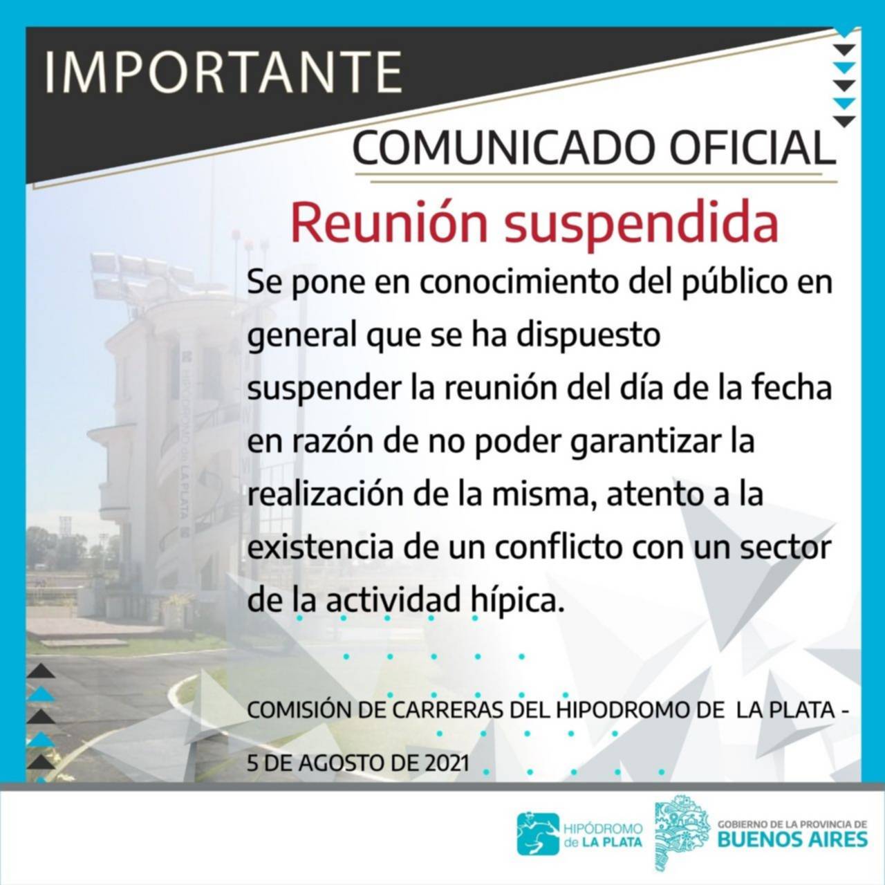Trabajadores de distintas áreas del Hipódromo de La Plata nucleados en la agrupación Familia de Turf continúan con la medida de fuerza que impide la actividad hípica en el predio de 44 y 118. El reclamo es por el pago de premios atrasados, malas condiciones de trabajo, falta de infraestructura y por el seguro médico. De esta forma, la Comisión de Carreras informó hoy en un comunicado que "se ha dispuesto suspender la reunión del día de la fecha en razón de no poder garantizar la realización de la misma, atento a existencia de un conflicto con un sector de la actividad hípica".