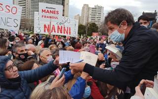 Poco después de que los precandidatos locales tomaran la palabra, Facundo Manes llegó hasta el escenario montado en el centro de la Plaza caminando entre la gente. Fue casi en el mismo momento en que el cielo terminó de nublarse súbitamente y se largó a llover. Al llegar al escenario, el médico tomó el micrófono: “Esta lluvia nos aporta más épica”, dijo al empezar su discurso ante un público que ignoró el chaparrón y permaneció escuchándolo hasta que pasado un cuarto de hora, la lluvia se detuvo. Recordó a René Favaloro, a José de San Martín, a Domingo Faustino Sarmiento. Tras su discurso, saludó a cada uno de los vecinos que se acercó y firmó libros de su autoría pero también otros. Le acercaron “Memoria política”, de Raúl Alfonsín, para que lo firme y lo dedique. También una biografía de Favaloro y “Juan Salvador Gaviota”, de Richard Bach. Incluso, posó junto a una remera de la Franja Morada y otra de la Juventud Radical. “Mis hijos quieren una foto con Facundo”, dijo un hombre que llegó acompañado de cuatro chiquitos y llevaba a un quinto alzado. Facundo Manes habló por micrófono unos 20 minutos y firmó libros y se sacó fotos durante más de 50.