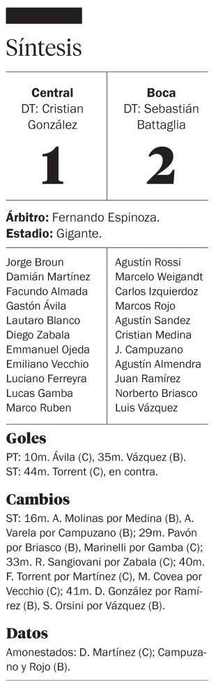 Boca venció anoche a Rosario Central, 2 a 1, sobre el final de un frenético partido jugado en el Gigante de Arroyito. Los goles fueron convertidos por Gastón Ávila para Central y Luis Vásquez para Boca, ambos en el primer tiempo, y el ingresado defensor local Fernando Torrent marcó en contra de su valla sobre el final del encuentro.