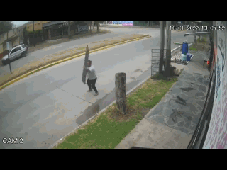 Allí, según se puede apreciar en las filmaciones de las cámaras de seguridad de un negocio, un hombre que se encontraba retirando las rejas del frente de su comercio, vio acercarse a dos presuntos “motochorros” que perseguían a un joven motociclista para robarle. Ante esa situación, el comerciante les arrojó una de las rejas de su local para detenerlos.