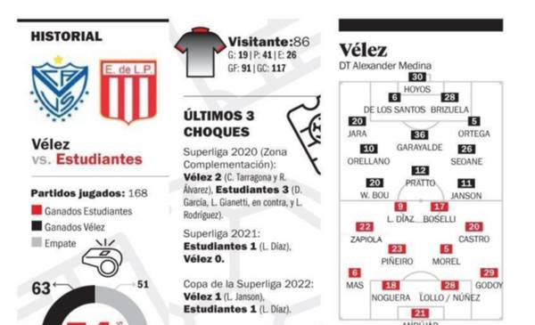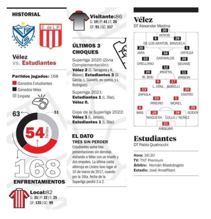 Estudiantes visitará hoy a Vélez (ambos equipo de muy flojas campañas en el torneo), con la obligación de conseguir un empate para asegurarse un lugar en la próxima edición de la Copa Sudamericana. El partido, válido por la 26ta. y penúltima jornada de la Liga Profesional de fútbol, se jugará desde las 16:30 en el estadio José Amalfitani, tendrá el arbitraje de Hernán Mastrángelo y la televisación de la señal de cable TNT Sports.