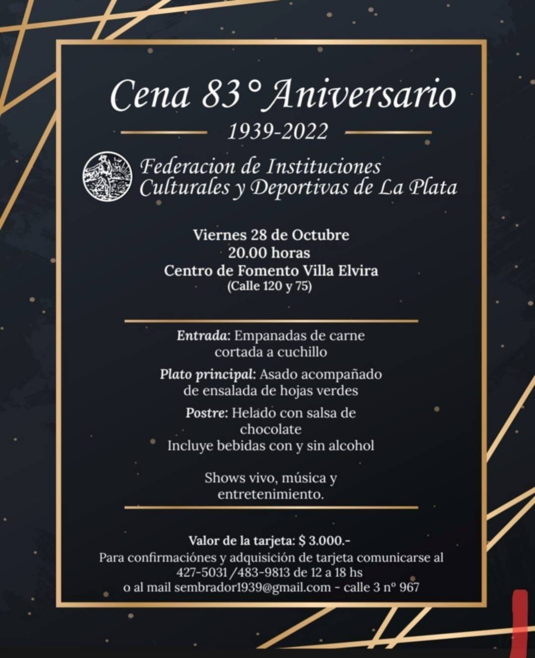 La Federación de Instituciones Culturales y Deportivas de La Plata se reunirá el próximo viernes 28 de octubre para celebrar un año más de vida. La tradicional reunión anual congregará a todos los clubes y centros culturales que la integran.