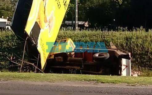 Pero eso no fue todo ya que por el fuerte impacto tras la pérdida de control, un enorme cartel publicitario terminó encima del rodado. Esa enorme estructura de fierros no golpeó al conductor de milagro, por lo que no sufrió heridas.