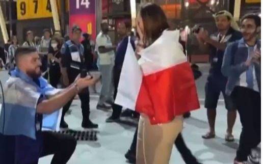 El argentino estaba envuelto en una bandera de Argentina y se arrodilló para preguntarle a su novia si quería casarse con él. Mientras, ella tenía una bandera de su país en su mano y sobre sus hombros.