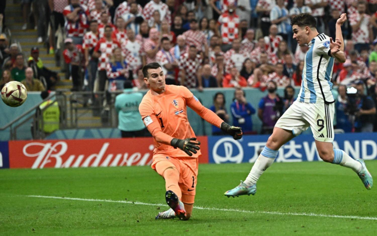 El delantero Julián Álvarez, a los 38m del primer tiempo, pone el 2 a 0 para Argentina sobre Croacia, en el partido que juegan en el estadio Lusail en busca de la final del Mundial de fútbol Qatar 2022.