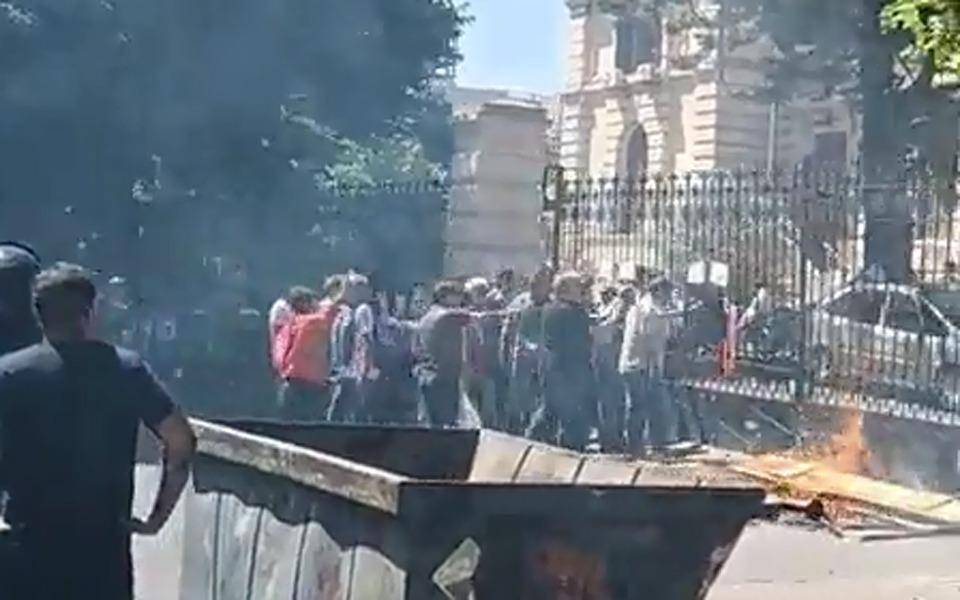 Además de arrojar piedras, los manifestantes embistieron con contenedores contra las rejas y prendieron fuego en los accesos.