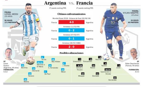 Pero también como una pulseada entre dos seleccionados que aspiran a bordar la tercera estrella en el escudo de su federación. Argentina fue campeón en 1978 y 1986, mientras que Francia coronó en 1998 y 2018.