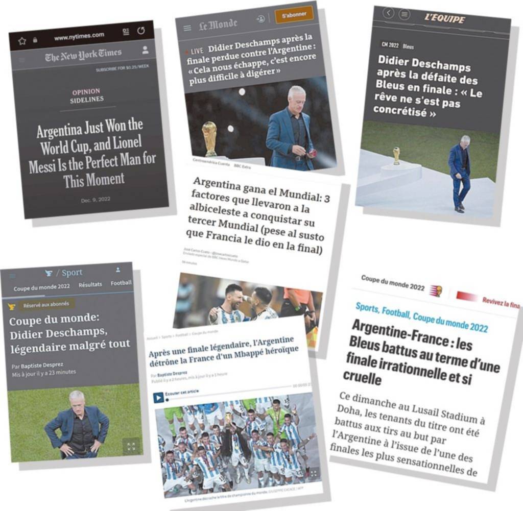 Los medios franceses se hicieron eco de la derrota de su equipo. Desde Le Figaro indicaron: “Tras una final legendaria, Argentina destrona a Francia con un heroico Mbappé” y, “Didier Deschamps no tendrá una buena Navidad. Digas lo que digas, no podrás cambiarlo con la derrota en la final del Mundial ante Argentina”.