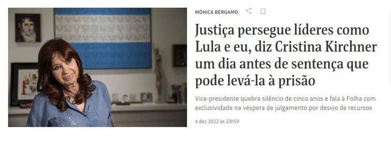 "El 6 van a dictar la sentencia. El 7 de diciembre va a ser publicada en los diarios. Ese día, el 7D, fue un emblema de nuestro gobierno con la ley de medios, que establecía que los dueños de medios que tenían demasiada concentración mediática debían desinvertir", dijo la expresidenta en una entrevista concedida al diario brasileño Folha de Sao Paulo, que compartió hoy en sus redes sociales.