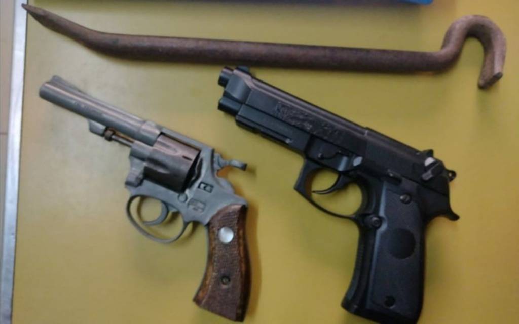 Con las características físicas y de vestuario de los sospechosos se montó un operativo cerrojo. Los tres sujetos fueron interceptados a las pocas cuadras. Tras reducirlos e identificarlos, los efectivos los registraron y hallaron entre sus prendas un revólver calibre 32, una réplica de pistola y una barreta.