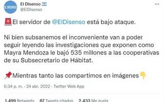 El portal periodístico "El Disenso" había publicado una denuncia por supuestos desvíos de fondos por parte de la intendenta de Quilmes, Mayra Mendoza, y luego aseguró que el sitio sufrió "múltiples ataques" que provocaron la caída de la web (vea: https://www.eldia.com/nota/2022-4-26-1-51-7-revuelo-por-una-denuncia-contra-una-intendenta-politica-y-economia).