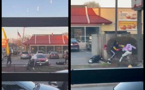 Un choque terminó en una batalla campal en la puerta de un McDonald 's de Boston. Todo comenzó cuando un auto Sedán Honda color rojo subió a la vereda y embistió a un joven en motocicleta, lo que provocó una pelea multitudinaria en la calle.
