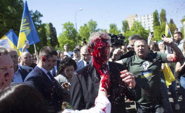 Manifestantes pro-ucranianos lanzaron pintura roja al embajador ruso en Polonia, cuando el diplomático se disponía a depositar ofrendas florales en el cementerio de Varsovia, donde descansan los restos de soldados soviéticos muertos en la Segunda Guerra Mundial. Los manifestantes, que gritaban “fascistas” y portaban la bandera nacional ucraniana, bloquearon el paso del embajador. (AFP)