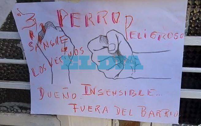 Este dogo ya cuenta con una denuncia radicada y en curso, con un escrache en las redes sociales y, en esta ocasión, la familia de la víctima hará “todo lo posible” para que no se repita. En la puerta del domicilio, los vecinos colocaron carteles para informar la situación.