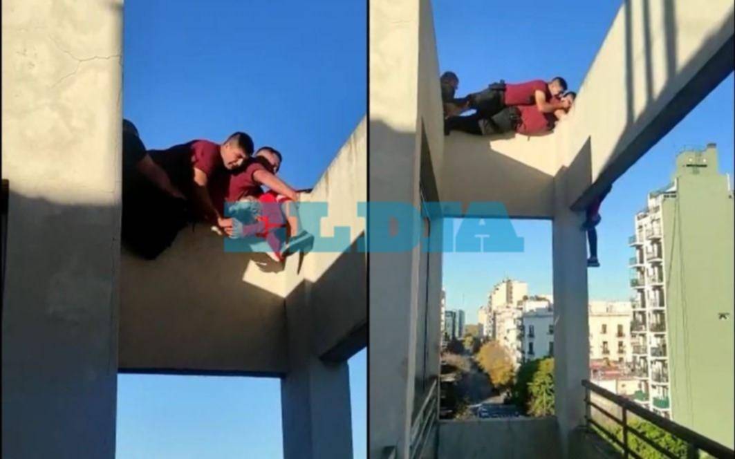 Cuando la joven se tira desde la terraza “arrancó el forcejeo” para lograr subirla y el rescate finaliza con éxito. El policía héroe pertenece a la Comisaría Vecina 1c de la fuerza de seguridad de la Ciudad.