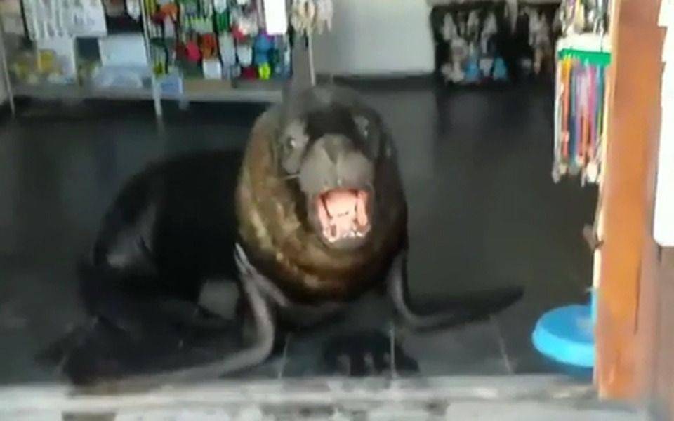 En las imágenes se observa a un lobo marino cómodamente parado en la puerta de uno de los locales de del paseo de la Banquina Chica de la zona del puerto de La Feliz.