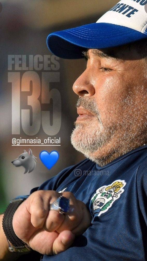 "Felices 135 Gimnasia", se destaca en la misma, junto a una imagen de Maradona vestido con la indumentaria del Lobo y tocándose el escudo en el pecho. La misma se hizo viral en redes sociales y los hinchas Triperos lo recordaron de la mejor manera. Cabe destacar que Diego fue el entrenador del primer equipo desde septiembre del 2019 hasta su deceso en noviembre de 2020.